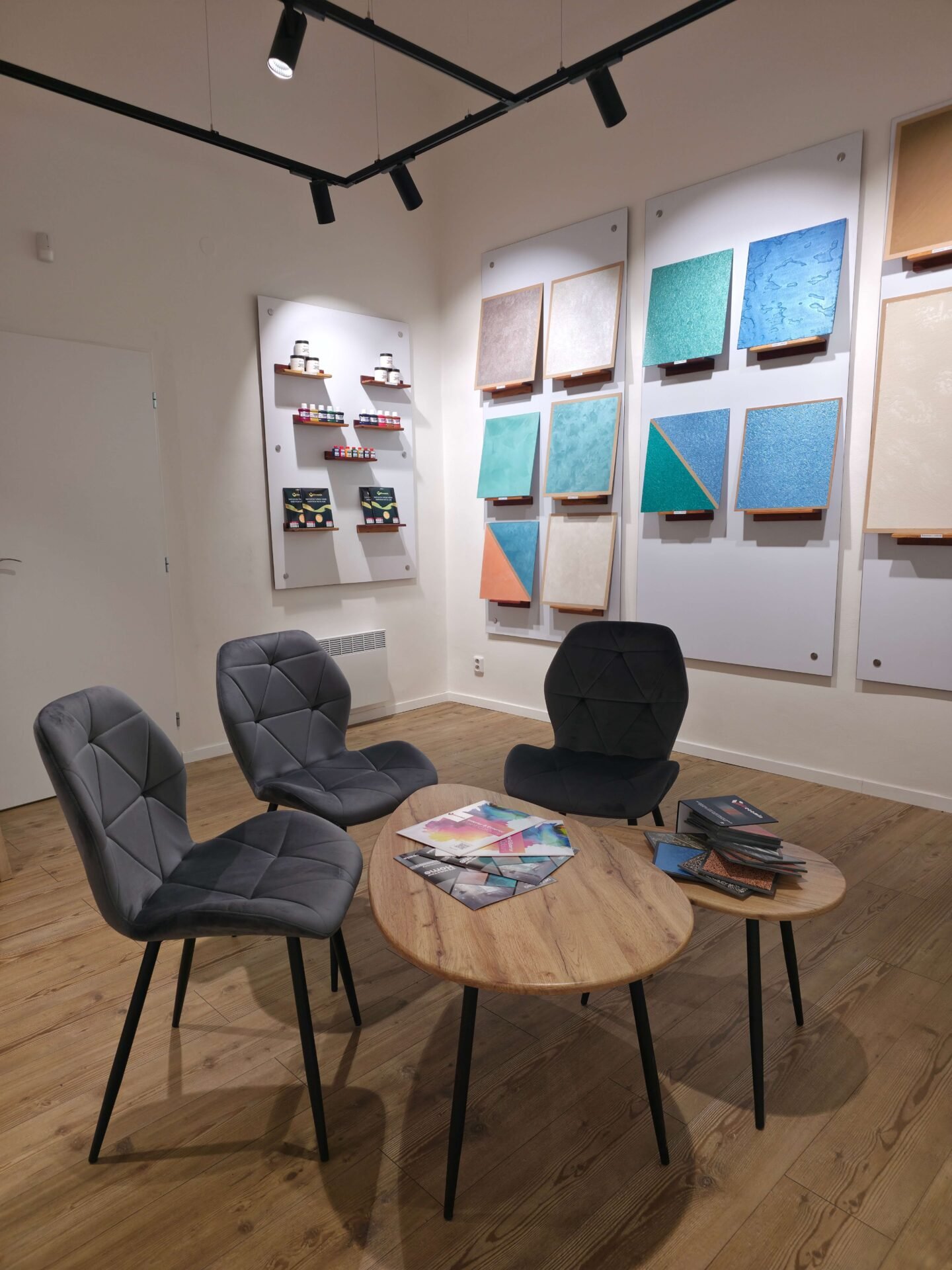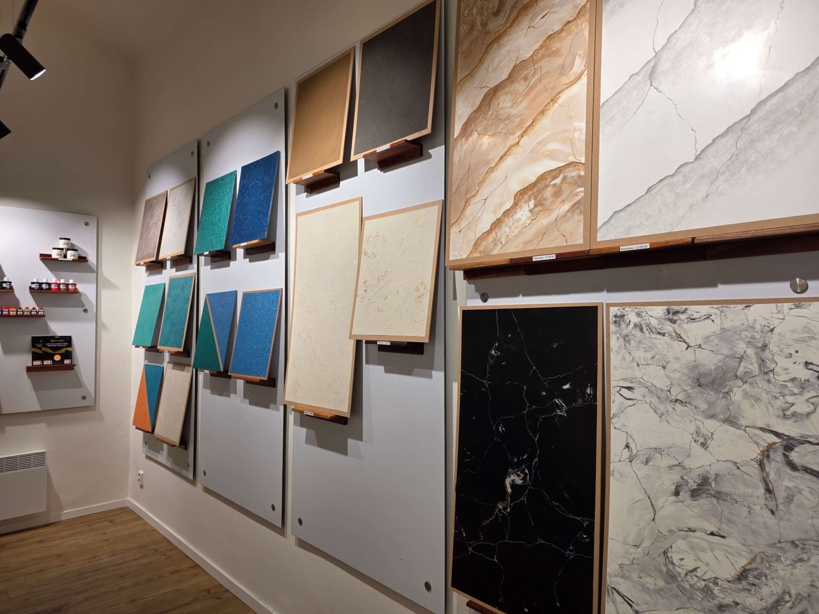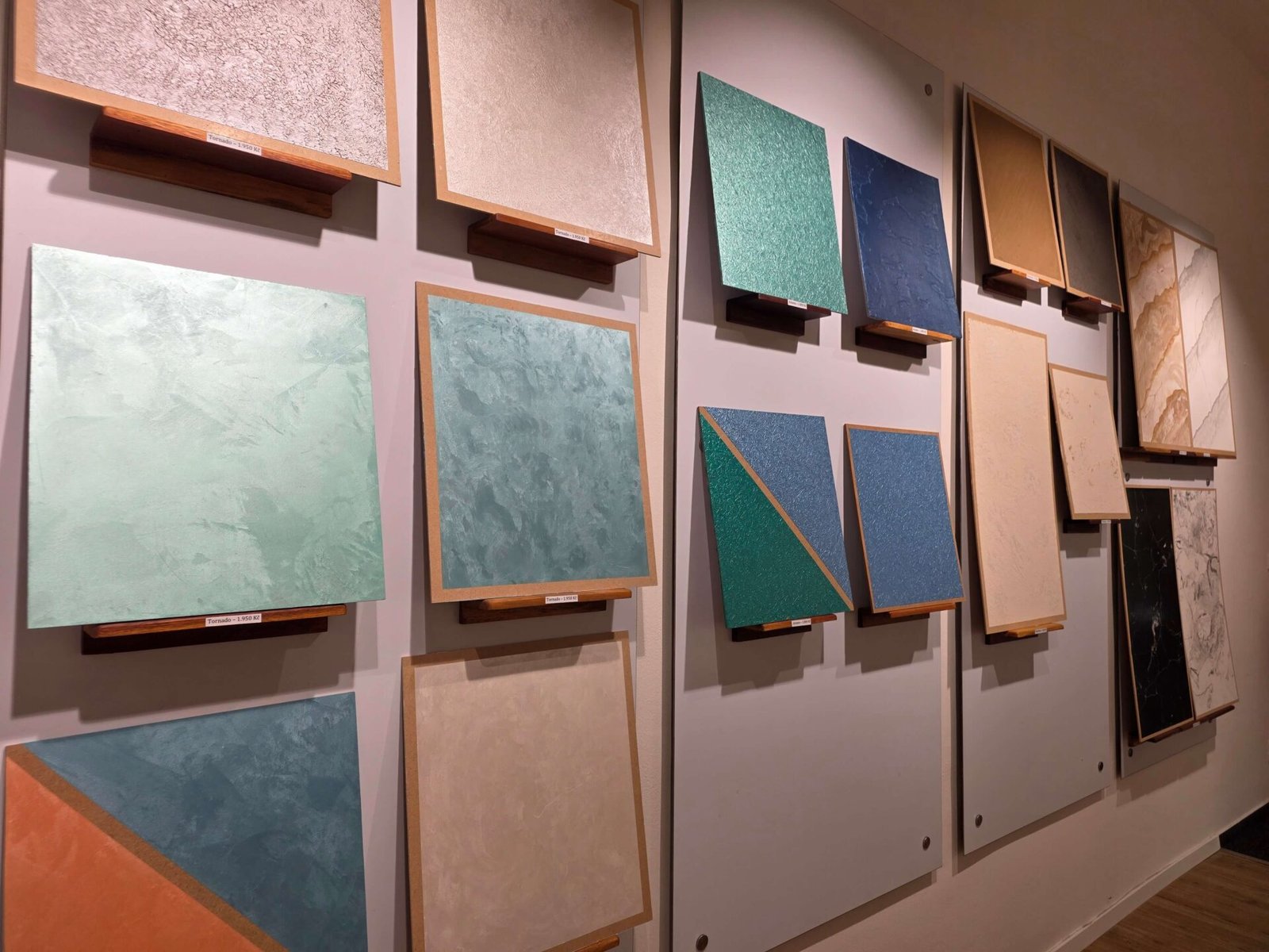 V našem pražském showroomu si můžete prohlédnout benátské omítky naživo. Na ploše přes 40 m² najdete různé vzorky textur, efektů a barev.